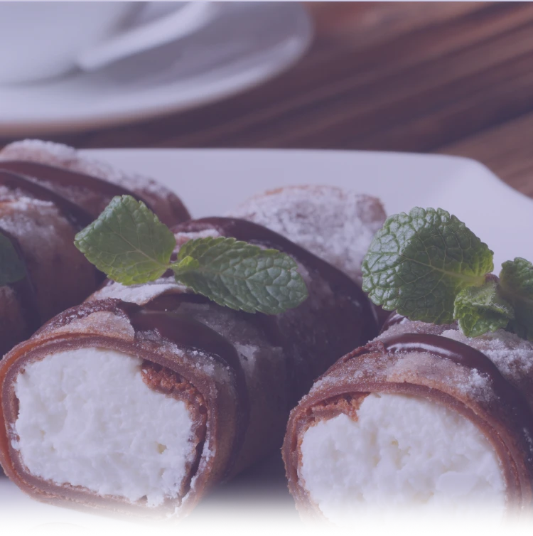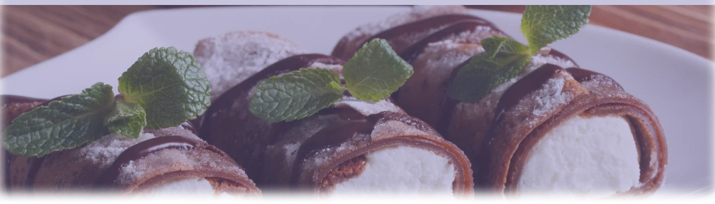 В шоколадный блинчик кладем немного крема (можно пользоваться кондитерским мешком), ломтики нектарина, и затем сворачиваем блинчики в рулетик. -